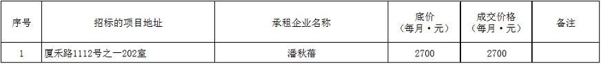 根據(jù)思明區(qū)國有企業(yè)資產(chǎn)出租管理的相關(guān)制度,我司2019年7月5日上午9:00起于觀音山營運中心2號樓2層2號會議室進(jìn)行公開招租現(xiàn)場開標(biāo),現(xiàn)通過思明控股網(wǎng)站對外發(fā)布成交公告,內(nèi)容如下: