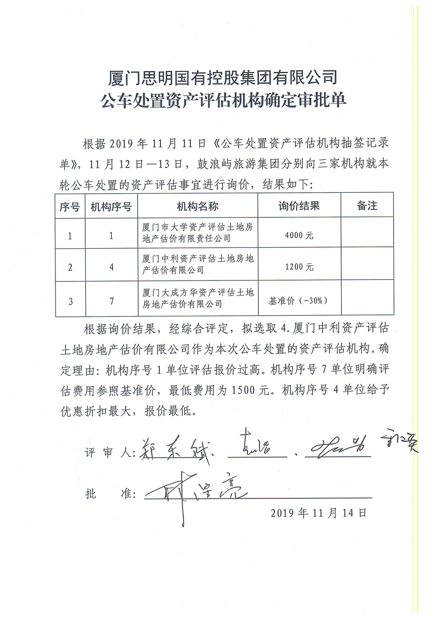 2.《思明控股公車處置(第四批)資產(chǎn)評(píng)估機(jī)構(gòu)確定審批單》;