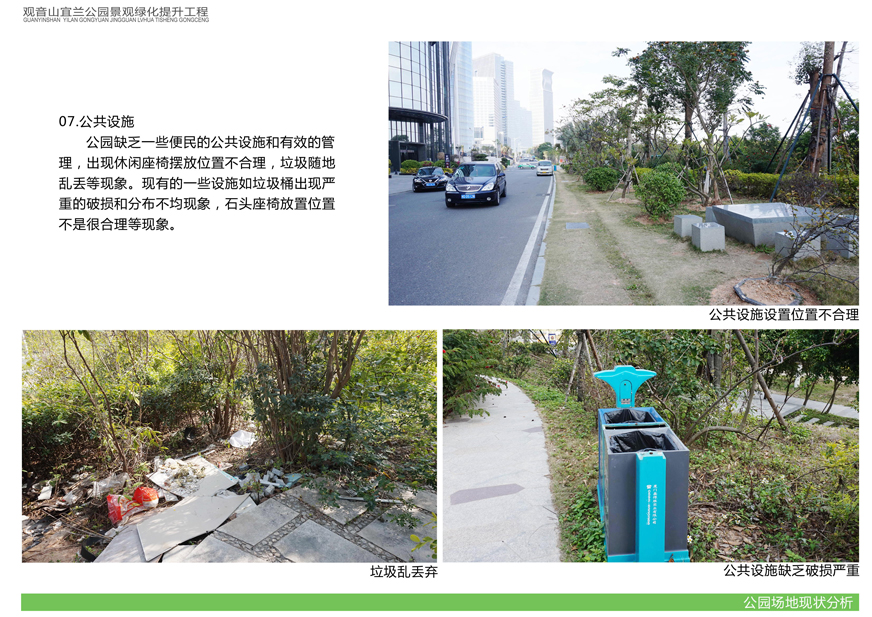 項目位于環(huán)島東路與觀音山商務營運中心之間,緊鄰城市干道環(huán)島東路及市政道路宜蘭路。該區(qū)域景觀綠化目前存在植被缺少后期養(yǎng)護,雜草較多,并出現(xiàn)倒伏現(xiàn)象,影響人行交通;各類設施老化,景觀帶內(nèi)垃圾無人清除,造成環(huán)境污染;區(qū)域兩側靠近車行道,缺少必要的人行園路,安全性較差;配套設施不完善,澆灌系統(tǒng)布局不合理等問題,嚴重影響城市形象,因此對現(xiàn)狀綠化進行整治十分必要。