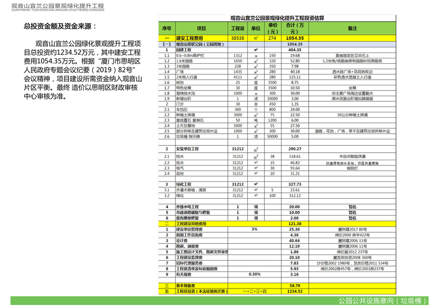 觀音山宜蘭公園景觀綠化提升工程由我司下屬廈門市開元國有投資集團有限公司負責建設,項目投資估算為1234.52萬元。