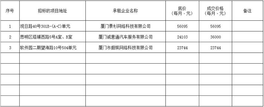 根據(jù)思明區(qū)國有企業(yè)資產(chǎn)出租管理的相關(guān)制度,我司2020年4月9日上午9:00起于觀音山營運中心2號樓2層2號會議室進行公開招租現(xiàn)場開標,現(xiàn)通過思明控股網(wǎng)站對外發(fā)布成交公告,內(nèi)容如下: