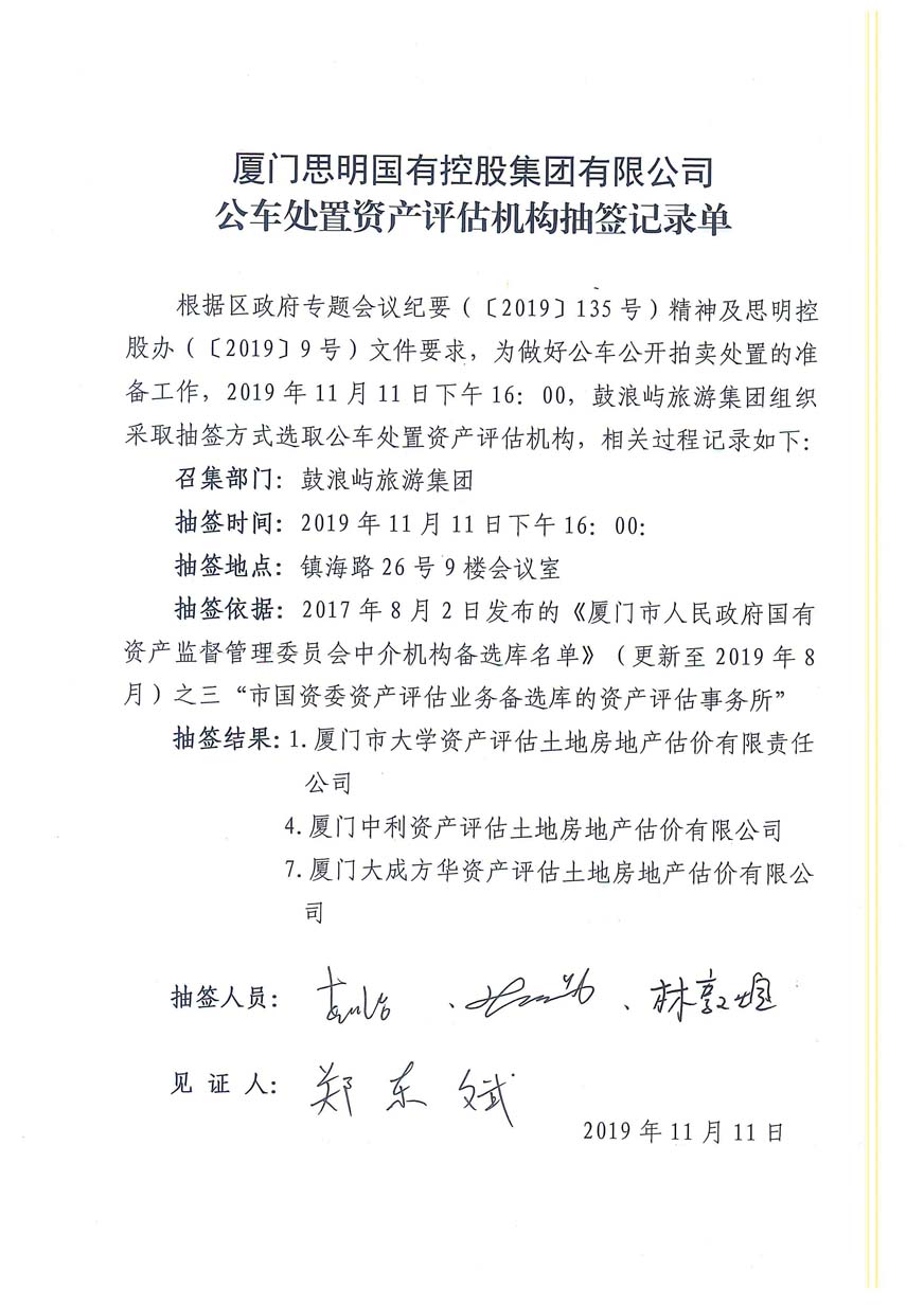 附件:1.《思明控股公車處置(第四批)資產(chǎn)評估機(jī)構(gòu)抽簽記錄單》;