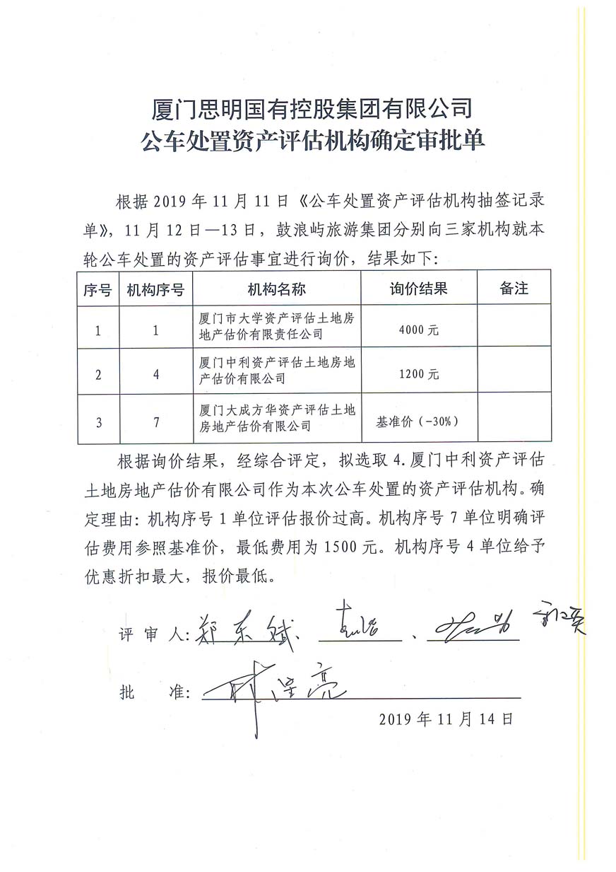 2.《思明控股公車處置(第四批)資產(chǎn)評估機(jī)構(gòu)確定審批單》;