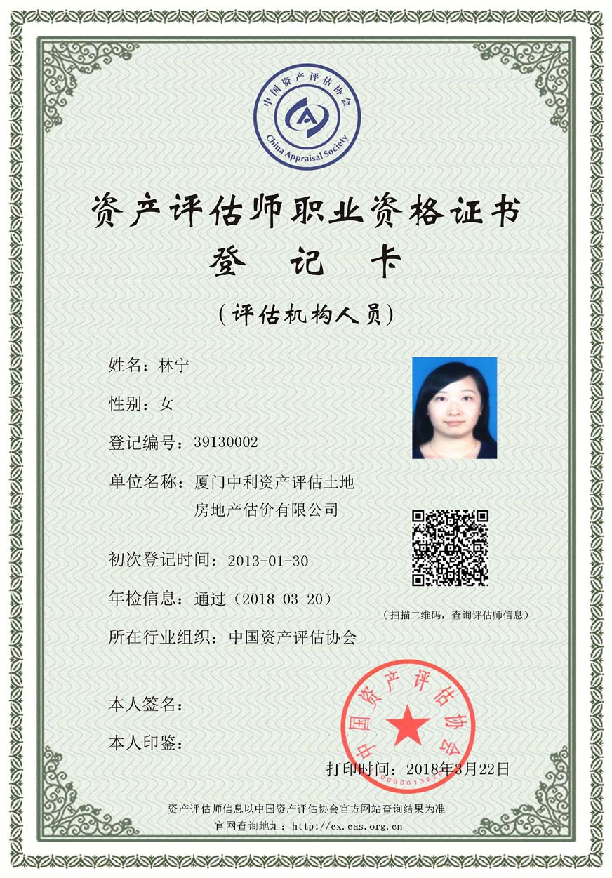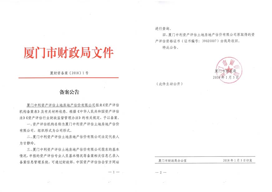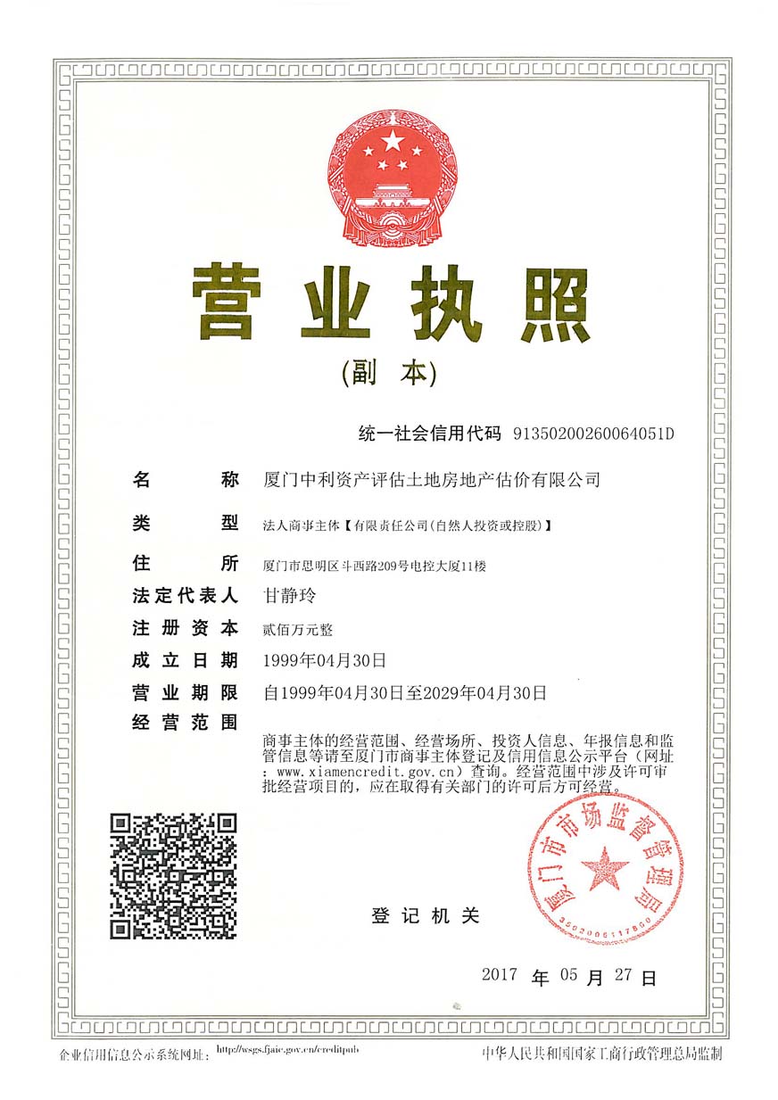 3. 廈門中利資產(chǎn)評估土地房地產(chǎn)估價有限公司營業(yè)執(zhí)照、評估資格證書復(fù)印件及注冊評估師林寧、鄭婷婷資質(zhì)證書復(fù)印件;