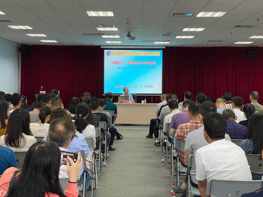 會上,牛君教授以“中國之治:制度自信與現(xiàn)實路徑-學習黨的十九屆四中全會精神”為題,從“四中全會與《決定》的意義影響”、“推進國家治理現(xiàn)代化的邏輯路徑”、“把制度優(yōu)勢轉(zhuǎn)化為國家治理效能”等三個方面深入解讀黨的十九屆四中全會的深刻背景和重大意義,對全會《決定》提出的總體要求、總體目標和重點任務(wù)進行了系統(tǒng)解讀。講授中,牛君教授特別結(jié)合中國應(yīng)對新冠肺炎重大疫情挑戰(zhàn)等典型事例,深刻闡述了中國特色社會主義制度和國家治理體系的顯著優(yōu)勢,觀點深刻、內(nèi)涵豐富,既有深入淺出的理論闡述,也有聯(lián)系實際的對策思考。