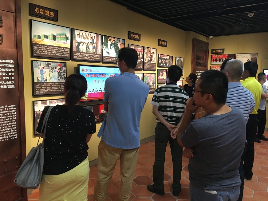陳列館分為三部分,一樓是廈門工運(yùn)史展,二樓是改革開放40年廈門工會(huì)工作成果展,三樓是羅揚(yáng)才、楊世寧烈士工作場(chǎng)景復(fù)原。全體黨員干部認(rèn)真傾聽現(xiàn)場(chǎng)工作人員的講解,了解廈門早期產(chǎn)業(yè)工人的誕生、發(fā)展史以及改革開放40年廈門總工會(huì)工作成果。