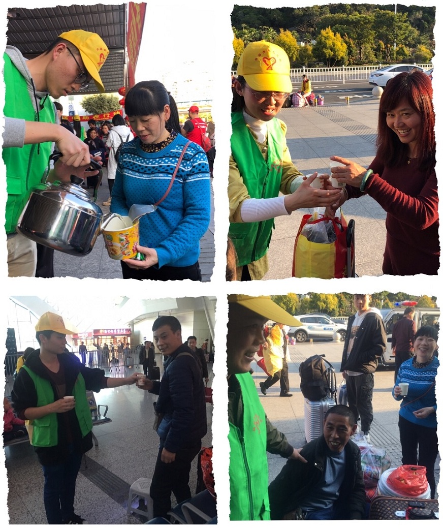 “請問我這張票要去哪里候車?”“請問一下梧村車站怎么走?”支部同志身著志愿者服裝一到場,就有許多受困旅客上前咨詢。每年春運(yùn)期間國內(nèi)各個(gè)火車站都會加派人手,做好各項(xiàng)準(zhǔn)備工作。但即便如此,依然會有許多旅客遇到困難,并難以在密集的人群中尋求幫助,在這個(gè)時(shí)候,分布在火車站各個(gè)地方的志愿者就是受困旅客最好的幫手。無論是各個(gè)車次的具體候車點(diǎn)、自助取票機(jī)的位置,還是周邊的餐飲、百貨、汽車站路線,甚至旅客需要開水時(shí),志愿者都有隨身攜帶熱水壺和紙杯為旅客提供方便。支部同志們無論走到哪,身邊都會圍繞許多尋求幫助的受困旅客,支部每一位同志都以最飽滿的熱情悉心答疑,以實(shí)際行動為人民服務(wù)。
