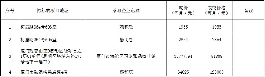 根據(jù)思明區(qū)國(guó)有企業(yè)資產(chǎn)出租管理的相關(guān)制度,我司2019年4月1日上午9:00起于觀音山營(yíng)運(yùn)中心2號(hào)樓2層2號(hào)會(huì)議室進(jìn)行公開(kāi)招租現(xiàn)場(chǎng)開(kāi)標(biāo),現(xiàn)通過(guò)思明控股網(wǎng)站對(duì)外發(fā)布成交公告,內(nèi)容如下: